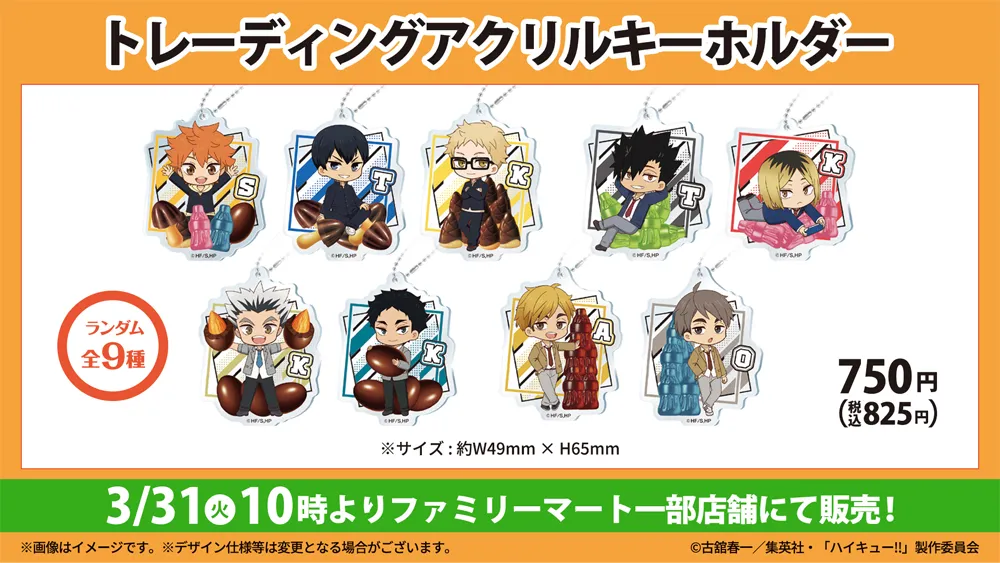 オリジナルグッズは「日向翔陽」をはじめとする、9人の描き起こしイラストを使用したトレーディングアクリルキーホルダーを販売しています。